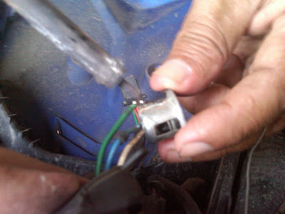 Ambil silet/ gunting sisit (opo toh bosone) kabel sampai tembaga keluar yang warna ijo kabelnya, kemudian masukkan ke lubang yang berjumlah 2 (kecil buanget) yang ada di dudukan lampu depan. Sebenarnya kalau hanya ditempel dan dimasukin sih nyala, akan tetapi buat jaga-jaga bjr solder pakai kawat, ya itung-itung tahan lama, sebenarnya bisa saja dudukan lampu depan dibeli di toko, akan tetapi memang berhubung hari sudah sore dan besok pagi buta harus gas lagi, jadi ya coba di perbaiki saja.